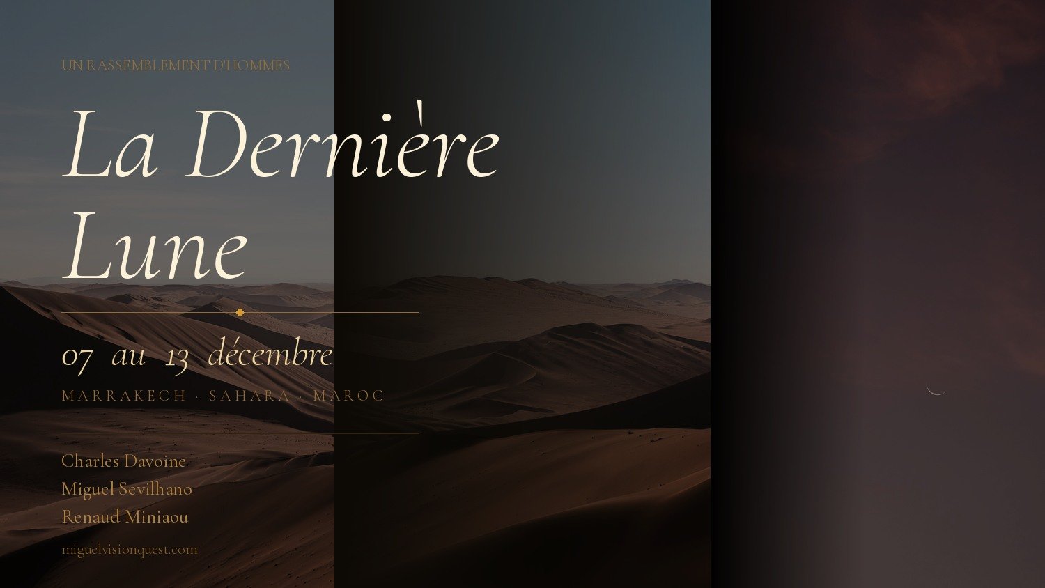 De ta vie quotidienne, tu arrives dans une villa privée proche de Marrakech. Et puis, progressivement, la route commence à dépouiller. Les montagnes. Le désert. Et enfin, le minimum. Juste le sable, le ciel, tes frères, et ce que tu es vraiment quand tout le reste disparaît.